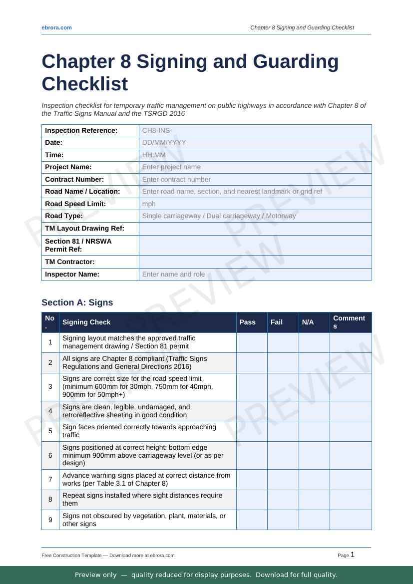 Free Word template: Chapter 8 Signing and Guarding Checklist. Download for UK construction sites.