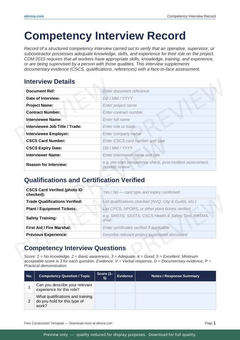 Free Word template: Competency Interview Record. Download for UK construction sites.