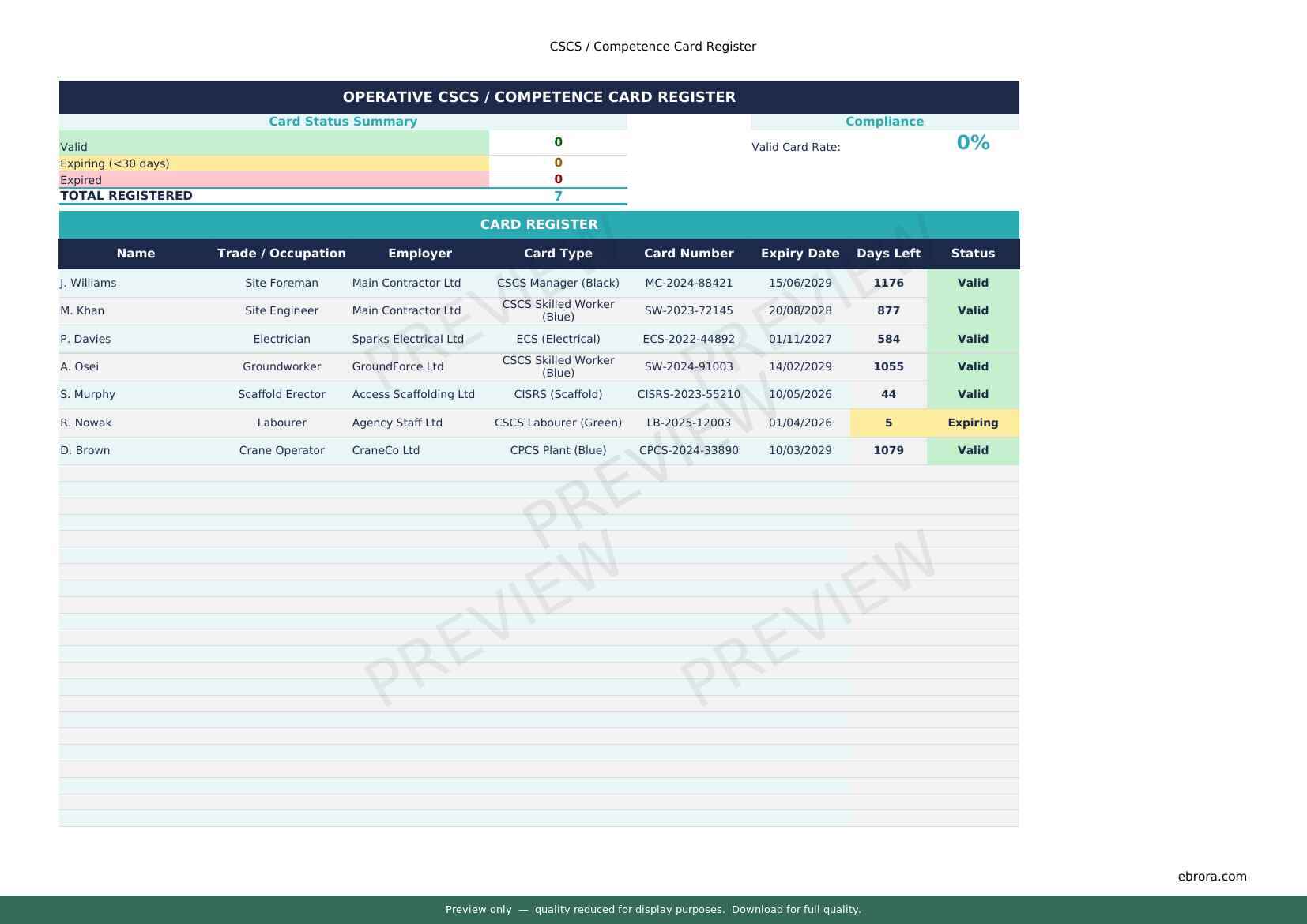 Free Excel template: Cscs Competence Card Register. Download for UK construction sites.
