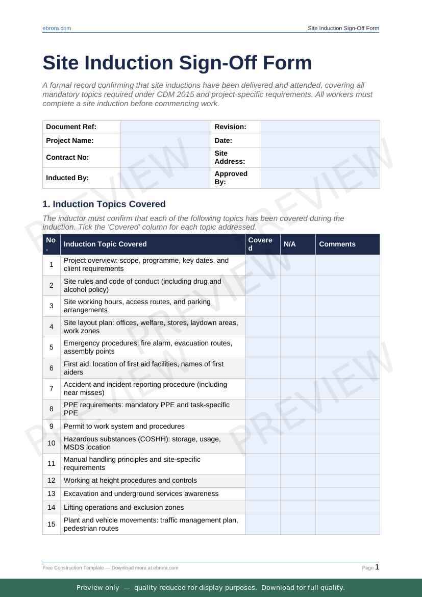 Free Word template: Site Induction Sign Off Form. Download for UK construction sites.