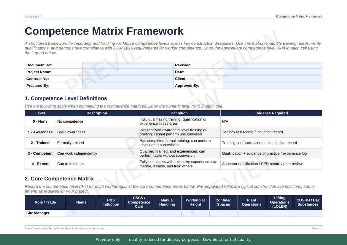 Free Word template: Competence Matrix Framework. Download for UK construction sites.