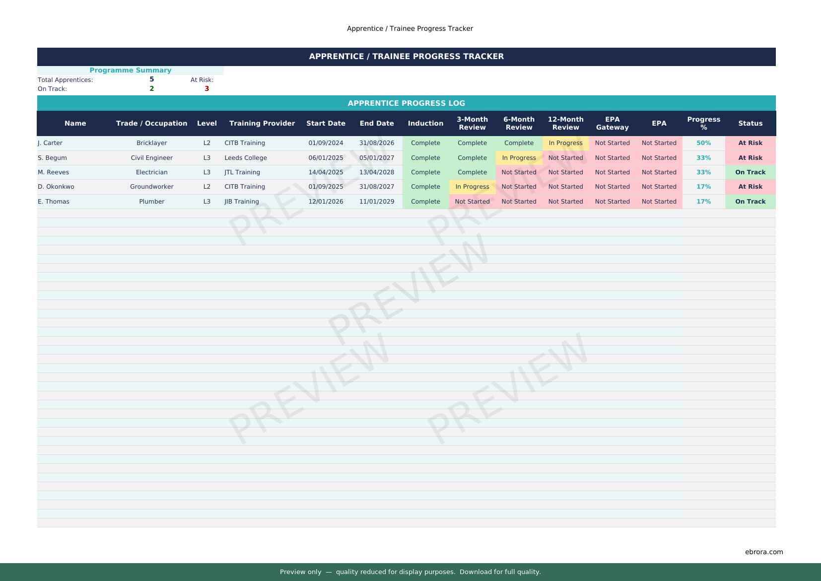 Free Excel template: Apprentice Trainee Progress Tracker. Download for UK construction sites.
