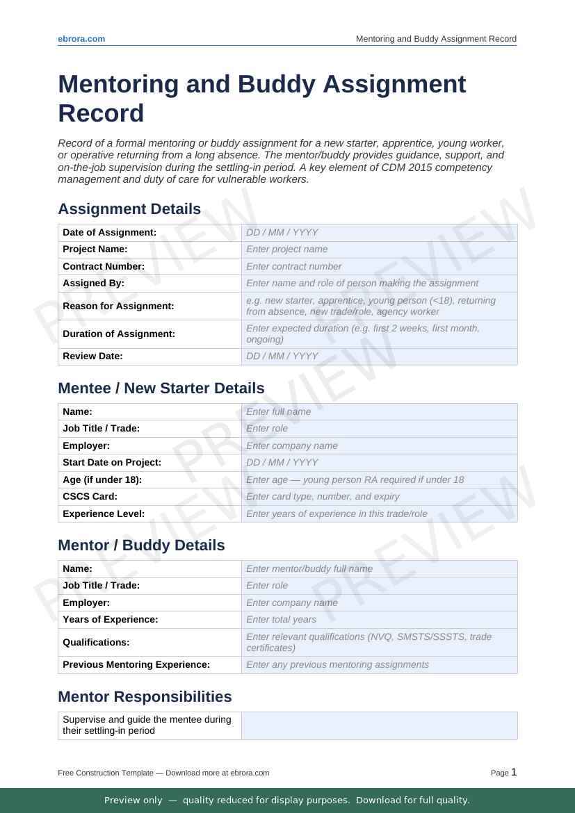 Free Word template: Mentoring and Buddy Assignment Record. Download for UK construction sites.
