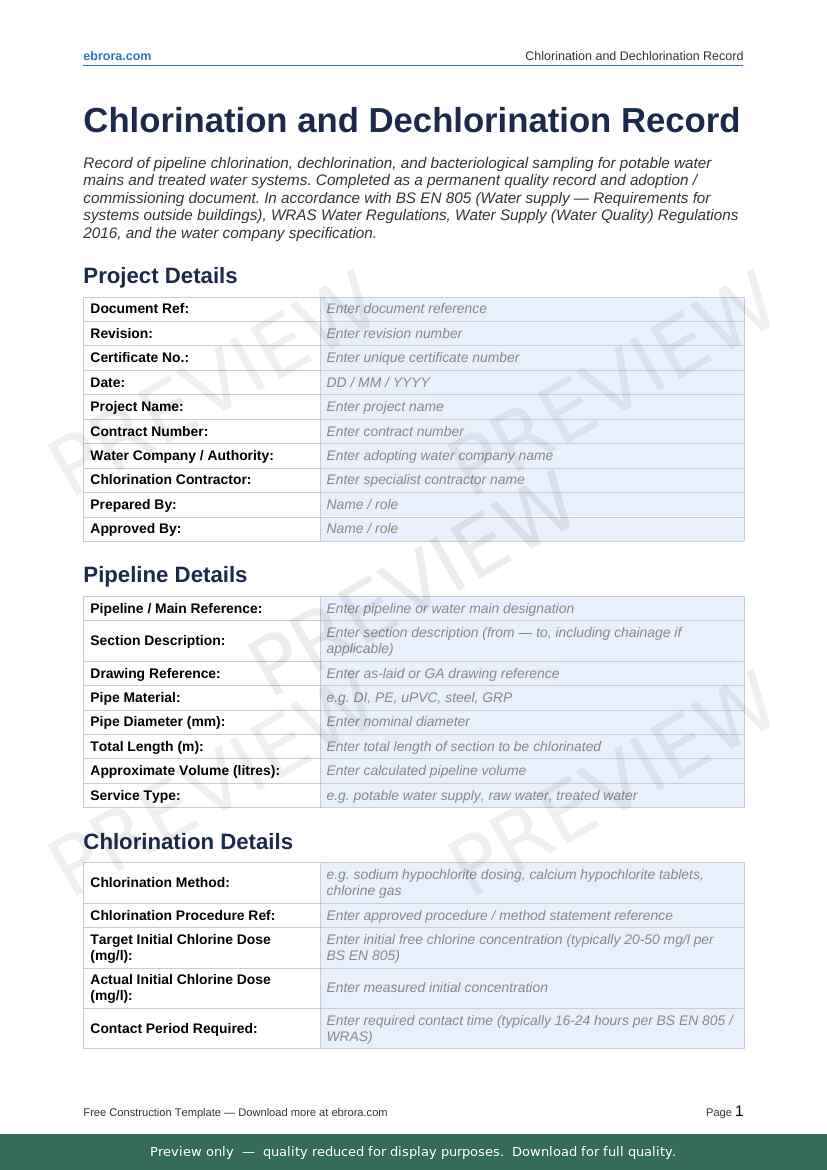 Free Word template: Chlorination and Dechlorination Record. Download for UK construction sites.