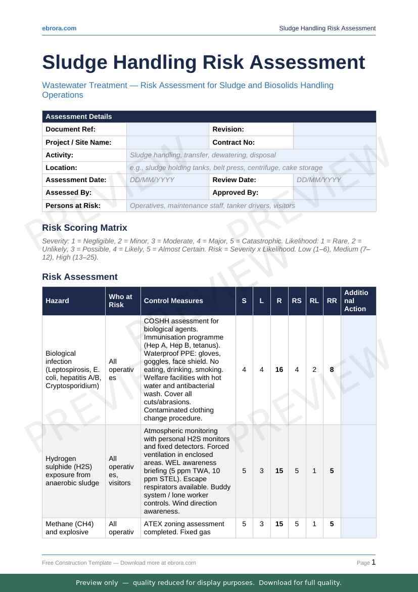 Free Word template: Sludge Handling Risk Assessment. Download for UK construction sites.