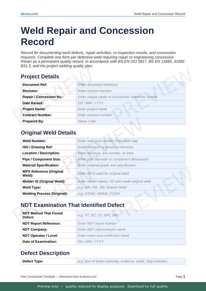 Free Word template: Weld Repair and Concession Record. Download for UK construction sites.