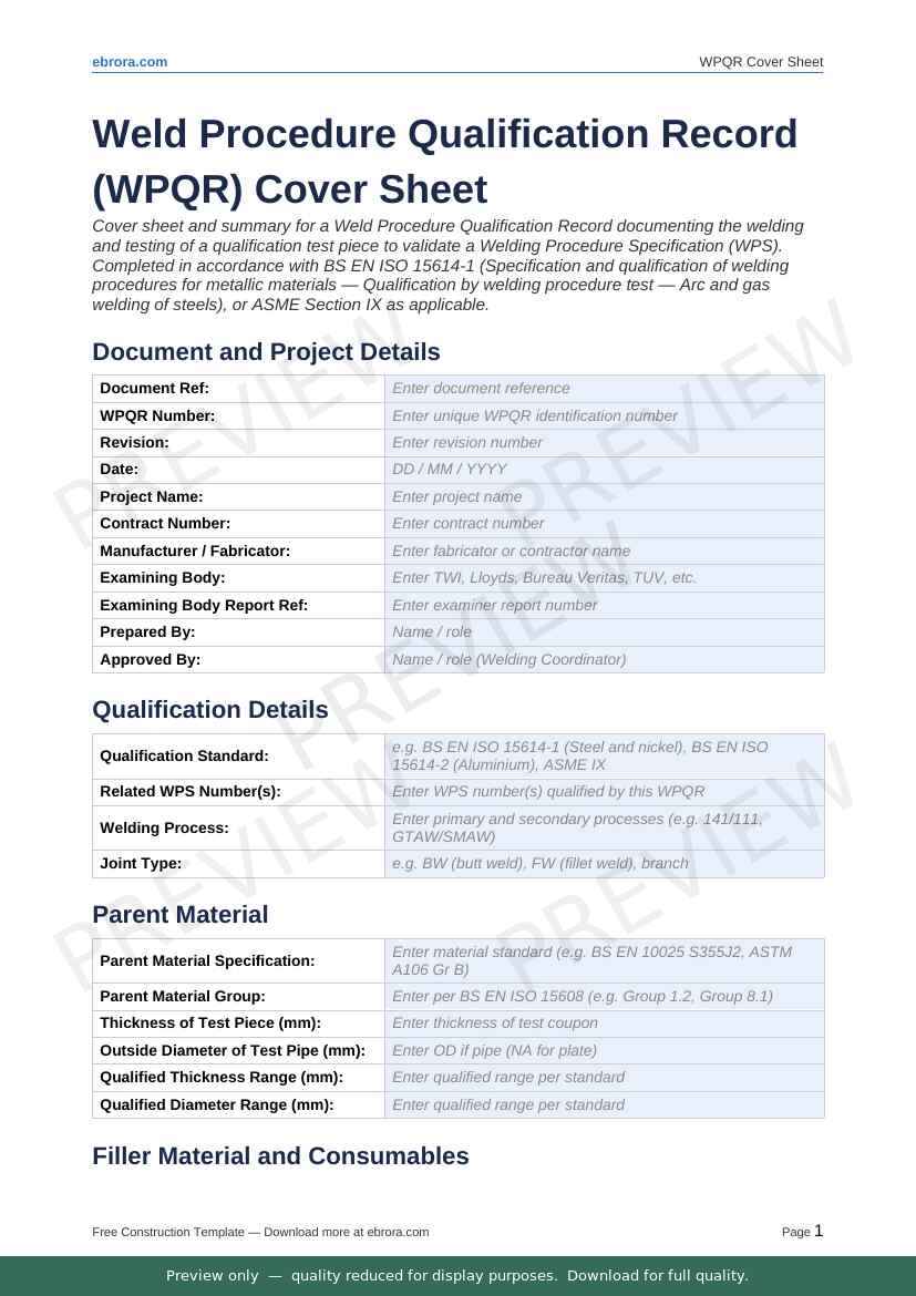 Free Word template: Weld Procedure Qualification Record Wpqr Cover Sheet. Download for UK construction sites.