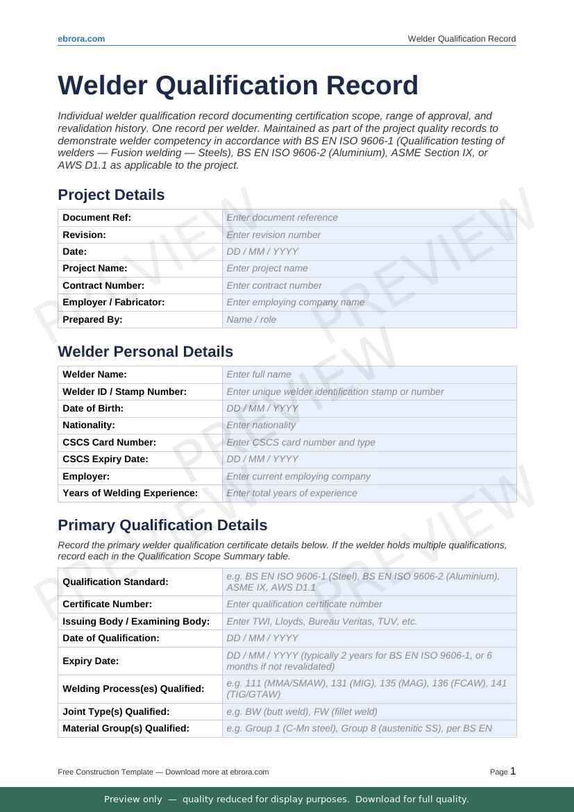 Free Word template: Welder Qualification Record. Download for UK construction sites.