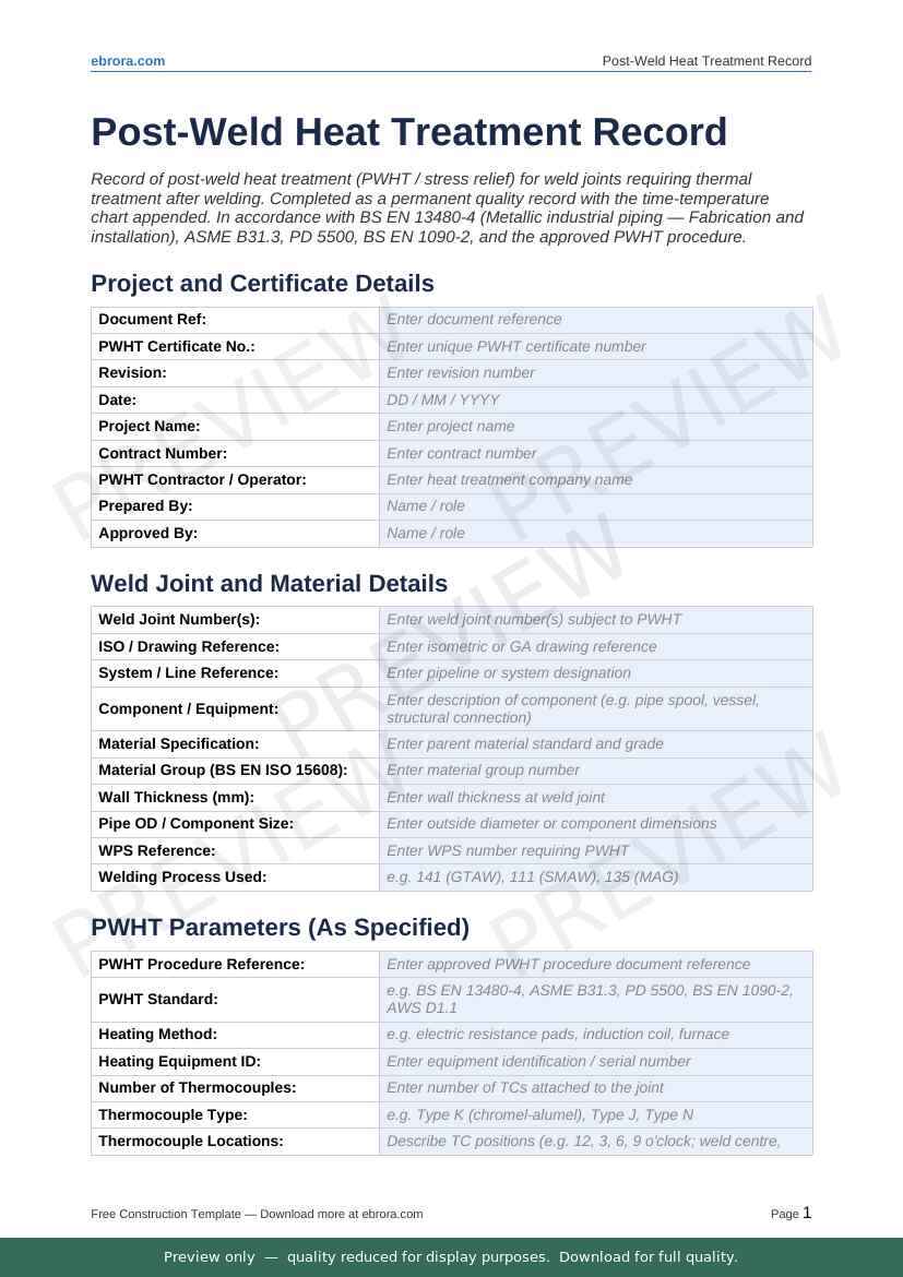 Free Word template: Post Weld Heat Treatment Record. Download for UK construction sites.
