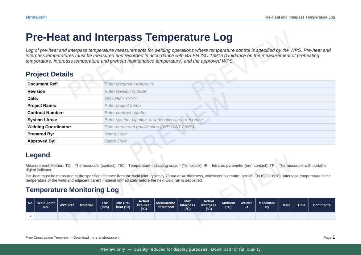 Free Word template: Pre Heat and Interpass Temperature Log. Download for UK construction sites.