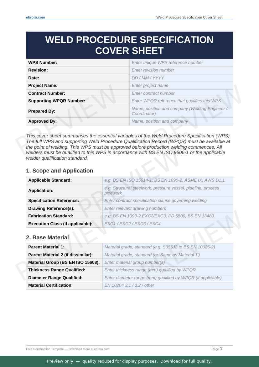 Free Word template: Weld Procedure Specification Cover Sheet. Download for UK construction sites.