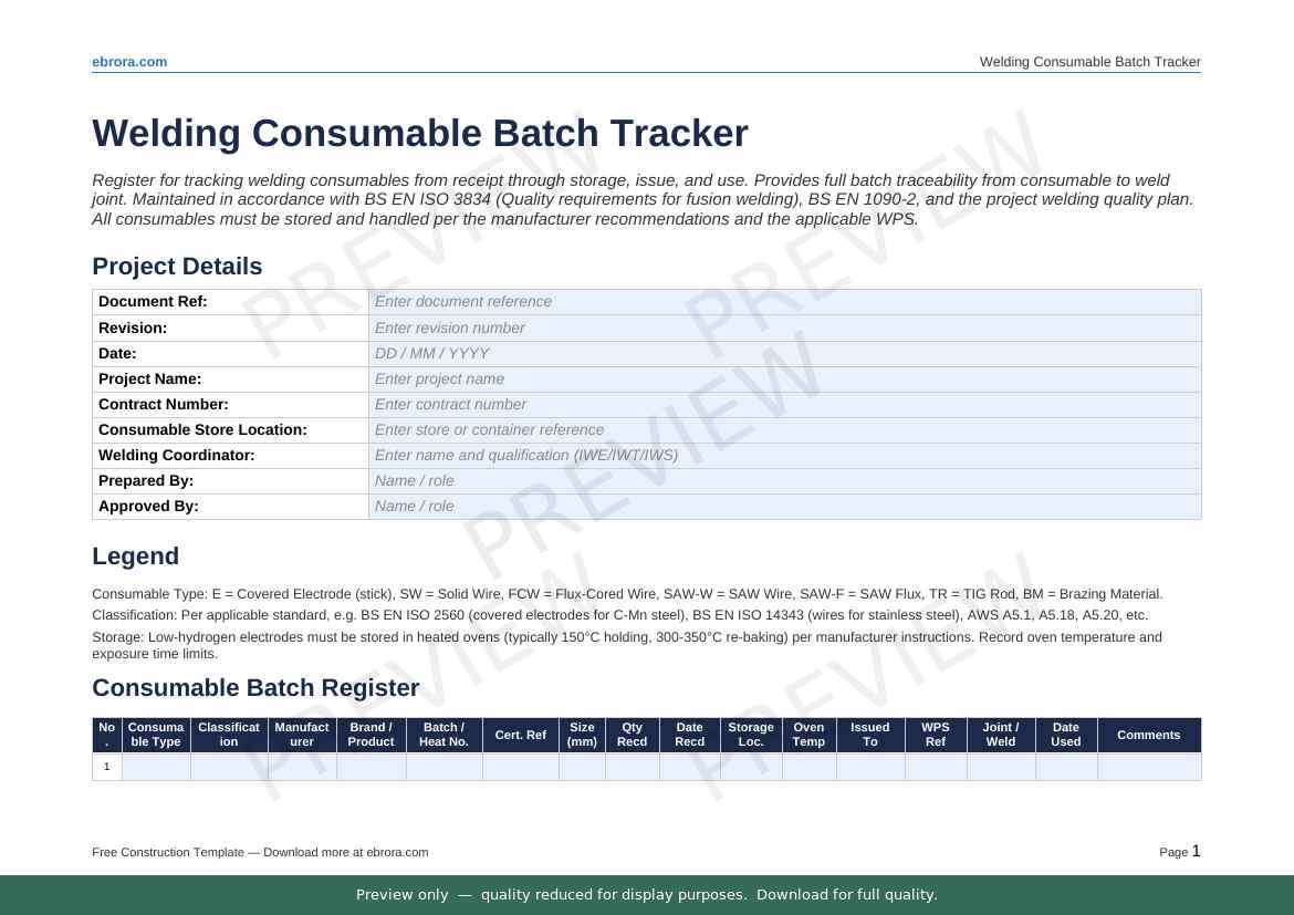 Free Word template: Welding Consumable Batch Tracker. Download for UK construction sites.